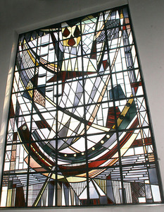 Durch dieses „Glaswunder“, das die Geheimnisstimmung bei Marc Chagall und die dichte, souveräne Phantasie Picassos in sich vereinigt, wird zwar der logische Bereich der Erfahrung überschritten, der Betrachter aber in den großartig tiefsinnigen Reigen des gesamten Heilsgeschehens eingeführt. Mit zugestandenermaßen subjektiver Phantasie kann der Betrachter ein über Berge, Fabriken und Häuser fahrendes Schiff (Kirche) erkennen, dessen Segel durch den von oben (Himmel) herkommenden Windhauch Gottes gebläht sind; drei Feuerzungen, den dreieinigen Gott symbolisierend, und von diesen ausgehende nach unten weisende vollflächige Pfeile mögen die Menschwerdung Gottes in Jesus Christus andeuten. Der Meditierende sollte sich hier Zeit lassen, um immer noch mehr zu „sehen“.