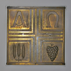 Diese Bronzetür verschließt den ehemaligen Tabernakel, der noch aus der Zeit vor den Kirchenraumreformen des vor dem 2. Vatikanischen Konzils stammt und ehemals auf einem Hochaltar direkt vor dem großen Christuskreuz stand. Die Tür ist in vier Quadrate aufgeteilt und zeigt oben die beiden Zeichen Alpha und Omega, das auf Gott als Anfang und Ende verweisen, und darunter drei Kornähren und eine Traubenrispe. Ähren und Trauben verweisen auf die gewandelten Gaben von Brot und Wein zu Leib und Blut Christi.