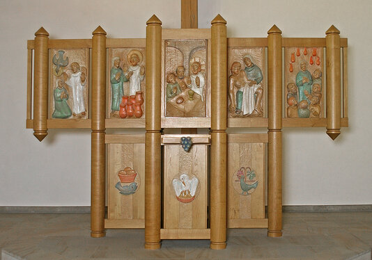 Zu Füßen des Kreuzes steht die Reliefwand, in deren Mitte sich der Tabernakel befndet. Sie ist aus Holz gearbeite und besteht in der oberen Reihe aus fünf und in der unteren Reihe aus drei Teilen. Die einzelnen Bilder werden durch runde Säulen mit kegelförmigen Abschlüssen voneinander getrennt. In der oberen Reihe sind Szenen aus dem Leben Jesu dargestellt: die Verkündigung – die Hochzeit zu Kana (Verwandlung von Wasser in Wein) – die Emmausszene (auf der Tabernakeltür) – die Pietà (Maria mit ihrem toten Sohn auf dem Schoß) – Pfngsten (Die Aussendung des Heiligen Geistes).