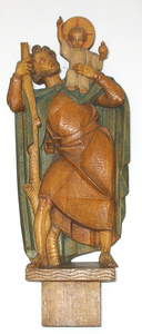 Die Figur des heilige Christophorus, des "Christusträgers" ist zirka 2m hoch und wurde 1958 aus Lindenholz geschaffen. Auch sie erhielt eine leichte Tönung. So wie der Heilige seinen Blick zur göttlichen Last auf seiner Schulter – dem Christuskind mit der Weltkugel – vertrauensvoll erhebt, so will er die Menschen zur Zuversicht ermahnen und ihnen auf ihren vielfältigen Wegen schützender Begleiter sein. Der Bildhauer hat sich ganz bewusst für einen jugendlichen Christophorus entschieden "als Symbol für die Jugend, die Christusträger sein soll."