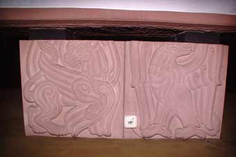 Die Altartischplatte, die im Ursprung ca. 80 cm länger war, ruhte auf vier aus-einander gezogene Quaderblöcken. Auf diesen waren die Symbole der vier Evangelisten zu sehen. Sie waren aus dem Stein heraus-gemeißelt .