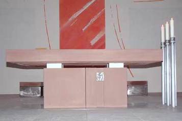 Der Altar Mittel-punkt der Kirche und der Eucha-ristiefeier hat seine jetzige Form im Jahr 2003 er-halten. Seine wür-devolle, schlichte Fassung mit dem im Altarfuss ein-gelassenen Reli-quiar ist für jeden sichtbar und strahlt Ruhe aus.