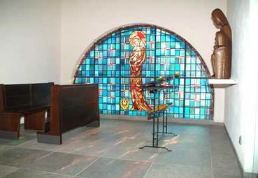 Im Unterge-schoss des Turmes, zugäng-lich vom Kir-chenraum aus, befindet sich eine Kapelle, die der Namens-patronin der Kirche St. Hedwig geweiht ist. Süßmuth schuf ein beeindruckendes Fenster, das dem Raum eine ganz besondere Stimmung gibt. Hedwig, die Schutzpatronin der Schlesier wird überdimensional im Rundbogenfenster dargestellt. Das Fenster ist halbrund. Es ist 3,40 m breit und hat im Scheitelpunkt eine Höhe von 2,10 m. Von außen ist das Fenster durch ein Schutzgitter gesichert, hat aber keine Schutzverglasung. Das eintretende Licht aus dem Süden hebt die Farben besonders hervor. Das Glasbild der heiligen Hedwig wirkt sehr lebendig.