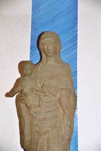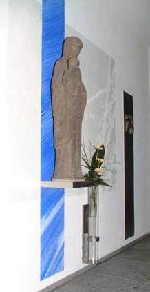 Besonders betont wird dieses Fenster und die Skulptur durch den linken blauen Streifen. Dieser beginnt am Fußboden mit einem vollen Dunkelblau deren Intensität bis zur Decke etwas schwächer wird. Dieser Balken symbolisiert die Mariensäule. Im Seitengang neben dem symbolischen Streifen befindet sich die Muttergottes. Die Madonnenstatue mit dem Kind wurde in den Kunstwerkstätten der Benediktinerinnen der Abtei Herstelle von Schw. Agape 1975 geschaffen. Grundmaterial ist Ton.