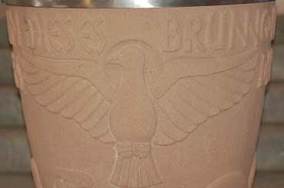 Ein bronzene Deckel deckte dieses Taufbecken bis 2002 ab. Gekrönt wurde dieser durch das alte Sinnbild Christi: Chi-Rho, die griechischen Anfangsbuchstaben des Namens Christi, in denen in unserer Darstellung auch das Kreuz angedeutet ist.