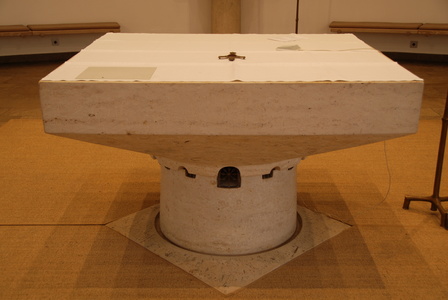 Bei der Gestaltung des Altarraumes musste der Künstler die rechteckige Altarplatte in Einklang mit dem runden Altarraum bringen. Er hat diese schwierige Aufgabe dadurch gelöst, dass er zunächst unten ein Quadrat kantig auf die Erde gelegt hat. Aus diesem Quadrat erwächst ein runder Altarstamm mit zwölf Öffnungen, vier große und acht kleine. Obenauf liegt eine rechteckige Altarplatte.